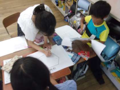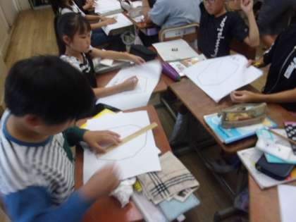 多角形の角の大きさの和の求め方を考えました。対角線を引いたり、切ったりしてグループで学習することができました。