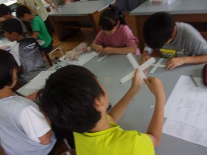 理科では、ブーメランをつくりました!紙をどう組み合わせたらよいかやおもりをつけたらよく飛ぶことなどを考えてつくることができました。