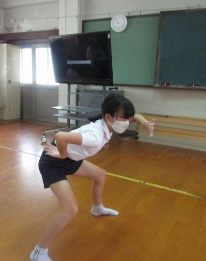 運動会の練習の様子です。「構え!!」の声の後の姿勢です。低い!!低いです!!きれいな姿勢ですね。全員がピタッと揃えられるように日々練習に取り組んでいます。