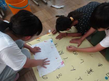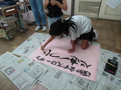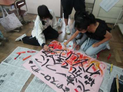 毎月代表委員会は、学校をより良くするために自分たちに何ができるのかを考えています。今月は、運動会と音羽まつりのスローガンを全校に知らせるために模造紙にスローガンをかきました。「熱い思いが伝わるように」「楽しい音羽まつりにしたいね」など思いを込めてかいていました。