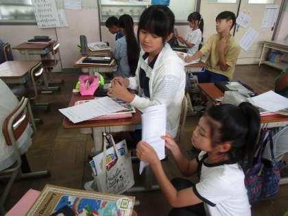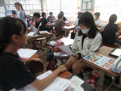 外国語の学習では、自分が行きたい国の魅力を伝えるために、どのようなことを伝えたらよいのかを考えています。隣のクラスの友達に魅力を伝えて、行きたい国ランキング1位を目指そう!!