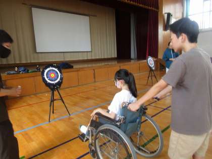 ハンドアーチェリーの体験をしている様子です。乗っている人のことを気遣って、ゆっくりと車椅子を押したり、「動きますよ」と優しく声を掛けたりしていました。大切な思いやりですね。