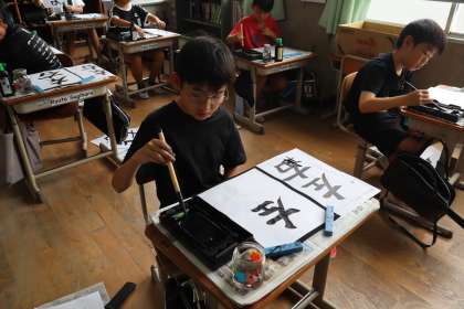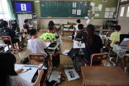 筆順や字形に気をつけて、「左右」という熟語を書きました。筆順や字形だけでなく、バランスにも気をつけて書くことができました。