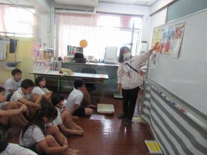 身長を測る前に、養護教諭の浅田先生からけがの手当ての仕方について話していただきました。手当ての仕方を知っていたら、けがしたときもひどくなるのを防ぐことができます。もう一度確認をすることができました。