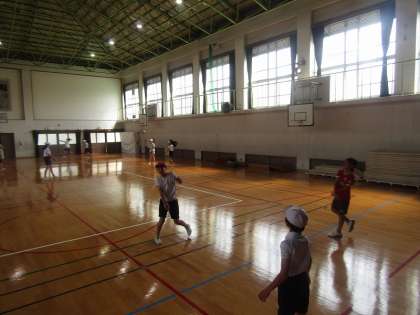 昼休みの体育館遊び。子ども達はこの日をとても楽しみにしています。バレーボールが好きな子が多いので、みんなでバレーボールをしています。まだまだ暑い日が続きますが、思いっきり体を動かすのは楽しいですね。