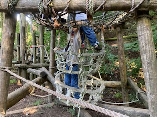 ロープのかごの中をよじ登ります。