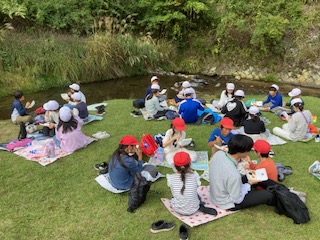 河原でお弁当。