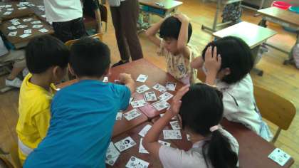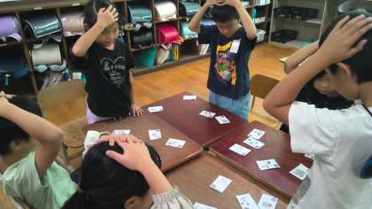 数え歌やことばあそび歌をみんなで繰り返し練習しました。その後、班ごとに「いろはかるた」をしました。