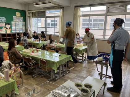 給食についての話のあと、配膳、試食、給食参観を行いました。