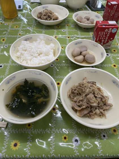 この日の献立は行事献立である「月見」献立で、「豚肉とこんにゃくのいため煮」「里芋の煮つけ」「とうふの吉野汁」「ごはん」「牛乳」でした。