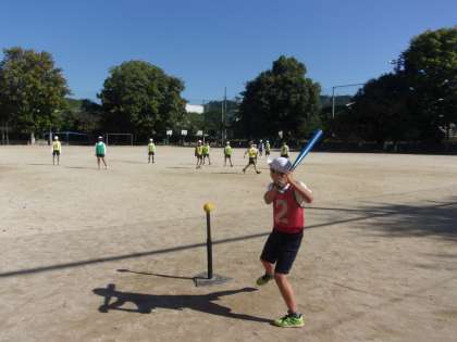 体育では、ベースボールの学習をしています。最初はルールを知らない児童がたくさんいましたが、今では楽しそうにベースボールに取り組んでいます。かっとばせー5年生!!