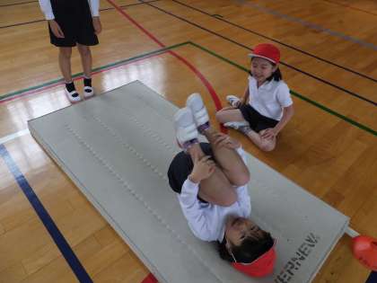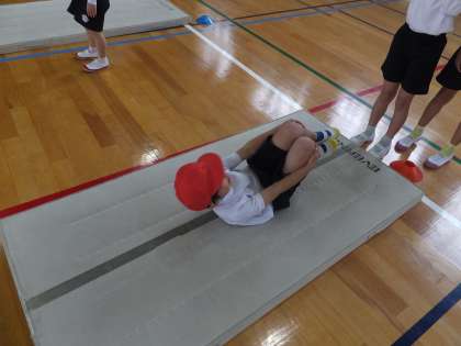 1年生の体育ではマットあそびをしています。