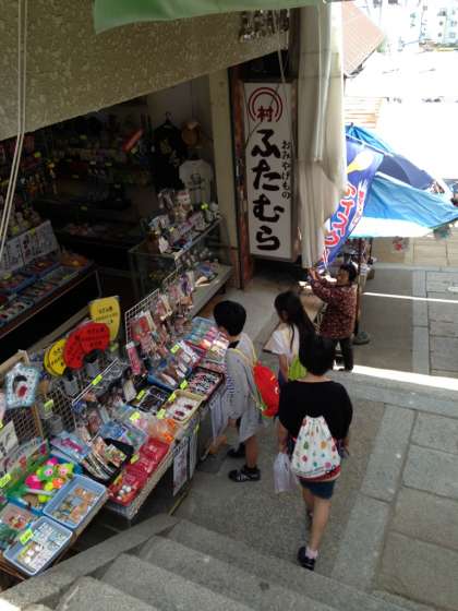 “こんぴらさん”で親しまれている金刀比羅宮の参道の長い石段を登りました。途中,お土産物屋さんで買い物も楽しみました。
