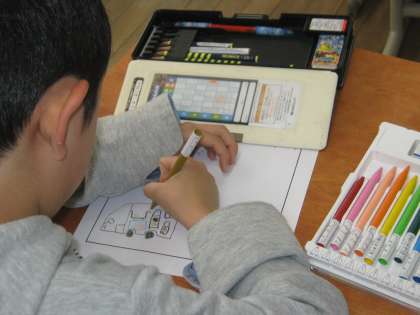 今日は2年生と「学校たんけん」に出かけました。その後,「見つけたよカード」に,今日の探検で発見したことを書いていきました。