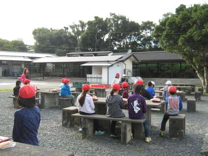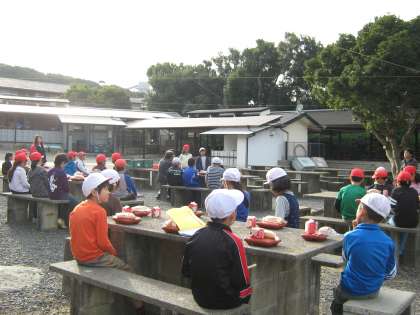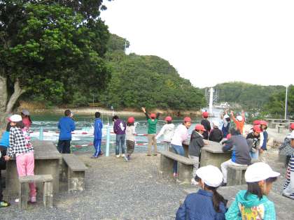 外のテーブルで,グループごとに朝食をいただきました。なんと…すぐ近くを船がとおっていきました!『いってらっしゃい!』と船にむかって手をふっている子どもたちです。