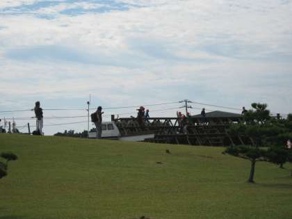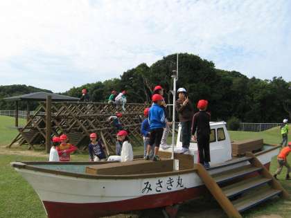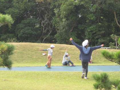 ひろーい芝生ランドで,楽しく活動している様子です。この後,体操服に着替えて,麦崎へ磯観察のために出発します。どんな感動体験がみんなを待っているのかな?