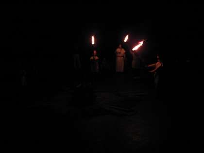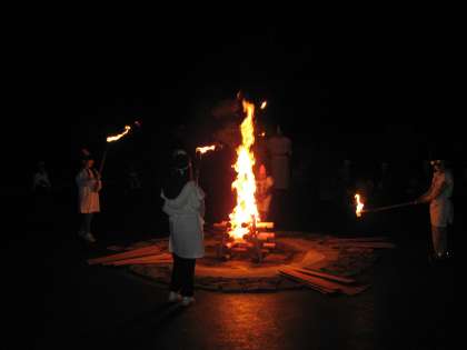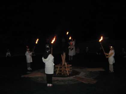 午後7時からキャンプファイヤーを行いました!みんなが第2営火場に到着後,火の子ども4人が登場しました。引き続き火の神さまが現れて,火を授けてくださいました。