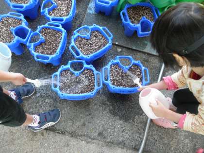 先日植えたあさがおにお水をあげました!『おおきくなあれ!』