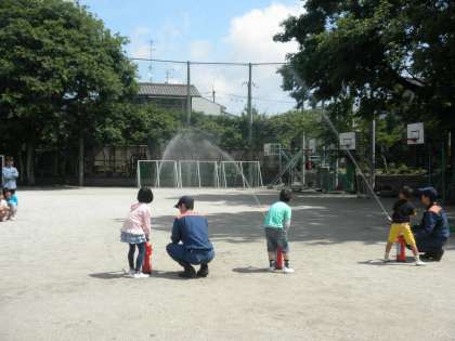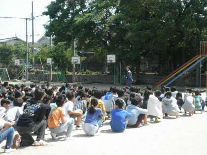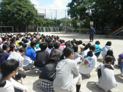 本日避難訓練を実施しました。火災発生を想定して,全校児童と教職員が運動場に避難しました。その後,消火訓練をして消防署員さんのお話を聞きました。