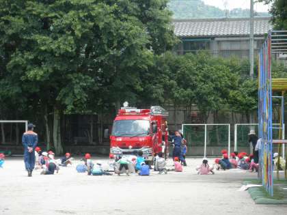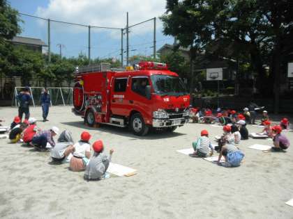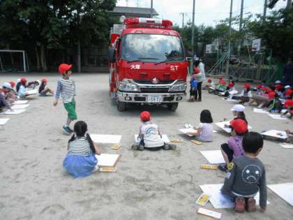 消防車のまわりでニコニコしながら絵をかいていました。消防署員さんに,『ここには何がはいっているの?』『このレバーはどんなふうに使うの?』といろいろな質問をしていました。作品のできあがりが楽しみです!