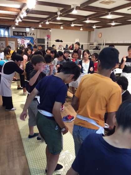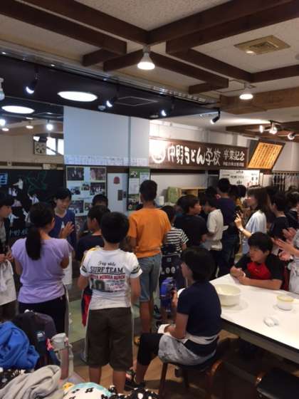 朝ごはんも食べ,元気に宿舎を出て,中野うどん学校でうどん作り体験をしました。