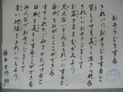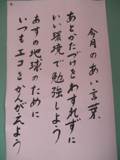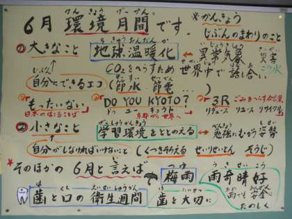 今日の朝会で,6月のめあてについて話しました。しっかりと背筋を伸ばして話を聞いている子どもたちです。また,昨日修学旅行から帰ってきた6年生の態度は,『音羽小学校の代表として,また,最高学年として,時間を守る,あいさつがしっかりできる,そして人の話を聞くことができる立派な態度でした。』と全校児童に話しました。6月のめあては職員室前に掲示しています。