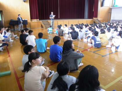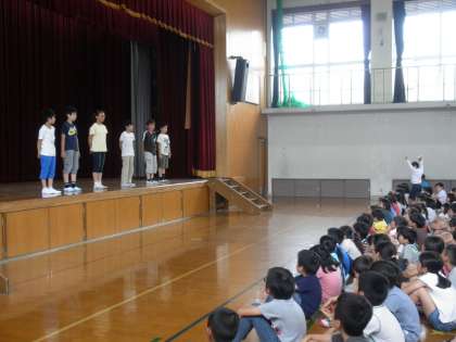 校長先生のお話に続いて,委員会からのお知らせがありました。始めに,給食委員会から,牛乳パックの片づけ方について,画用紙にわかりやすく絵を描いて説明してくれました。次に飼育委員会から,みんなに募集していたウサギの名前が『プリッツ』と『モカ』に決まったことのお知らせがありました。保健美化委員会からは,フッ化物洗口のコップを忘れないこと,手洗いうがいをすること,水分補給をすることについてお知らせしてくれました。最後に園芸委員会が,いろいろな季節の花を学校で育てているので楽しみにしてくださいとお知らせがありました。写真は,委員会児童が発表前に控えている様子と,舞台の上で発表している様子です。