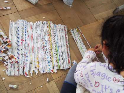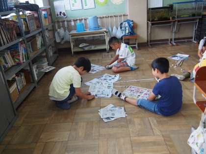 新聞紙や広告を丸めて棒をつくり,それをつなげてさまざまな形を作って楽しみました。
