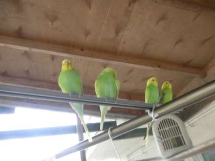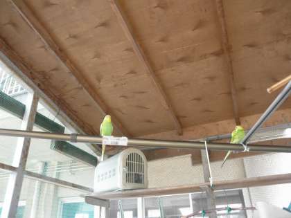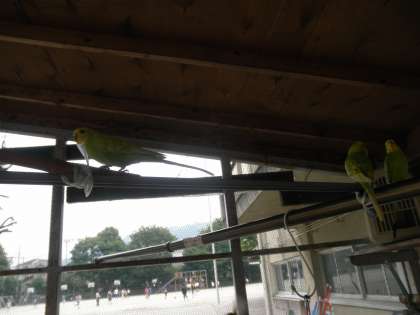 校長先生が雛のころから大事に育ててこられたインコたちです。小屋の中には止まり木も用意してもらい,元気に飛び回っています。子どもたちも興味津々な様子で,すぐに学校の人気者となりました。