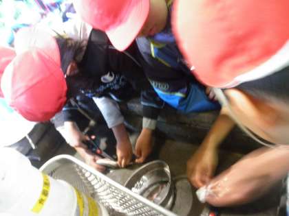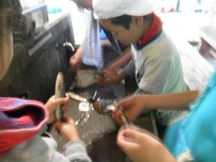 雨のため,炊飯場で『イワナ』つかみを行いました。大切な命をいただくことについてお話を聞き,自分たちで調理してイワナの塩焼きを食べました。貴重な体験活動になりました。みんな元気に活動しています。これから,体育館での活動です。