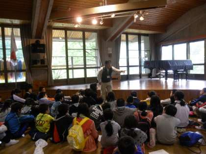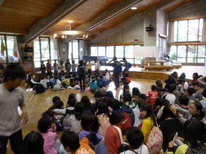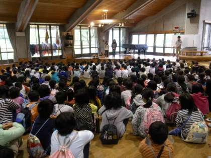 雨もあがりました。4小学校≪合同朝のつどい≫を7時からオリエンテーションホールでおこないました。学校紹介では,児童2名が代表であいさつしました。その後,本校の朝のつどいを行い,各班のめあてをかくにんしました。校長先生からのお話もしっかり聞きました。