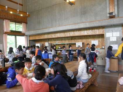 朝のつどいを終えて,食堂で朝食をたべました。これから,登山に出発します!みんな元気です!行ってきます☆