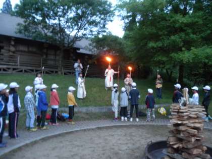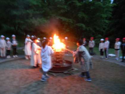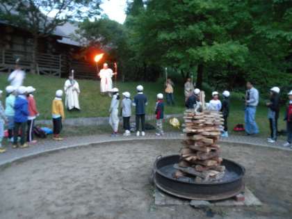 キャンプファイヤーは,火の神さまと火の子どもたちの登場で始まりました。厳粛な雰囲気の中にも,おもしろい演出があり,第1営火場はみんなの笑顔でいっぱいになりました。