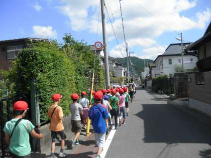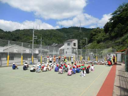 3年生が保育園の園児と交流するために,午前9時に学校を出発ました。40分ほどかけて,保育園のグラウンドに到着!これからいよいよ交流が始まります!