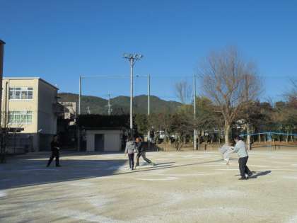 1月10日(火)から授業開始・給食開始です。子どもたちが元気に登校してくる姿を思い浮かべながら,教職員で運動場に凍結防止剤を散布しました。いよいよ学校スタートです!