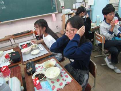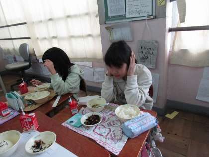 今日の給食は、はりはり鍋でした。「はりはり鍋」という名前は水菜のシャキシャキとした噛む音が「はりはり」と聞こえたことからつけられたそうです。だから今日はみんなで「はりはり」という音が本当に聞こえるのか耳をふさいで聞いてみました。「はりはりって言ってるかも!」「シャキシャキとは聞こえるんやけどな〜」と食感を楽しみながら給食をいただきました。