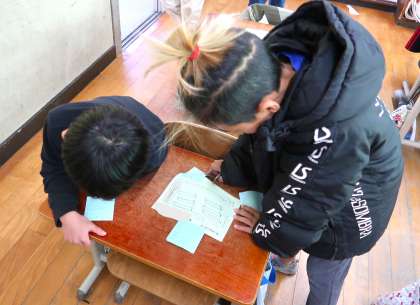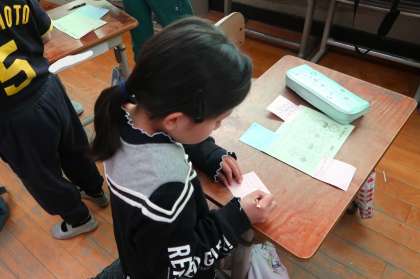 今日は、隣のクラスの「はっけんカード」を読み、付箋にコメントを書いて交流しました。
