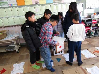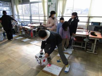 人間すごろくコーナー。自分が駒になってさいころが出た目だけ進んでいきます。進んだのに、戻るマスもあり大盛り上がり。無事にゴールできたときには拍手が起こりました。