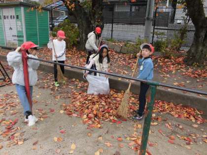 運動場にすごい数の落ち葉があったので掃除の時間にみんなで落ち葉拾いをしました。とってもとってもきりがなく、ごみ袋も10枚ほどがパンパンになってました。