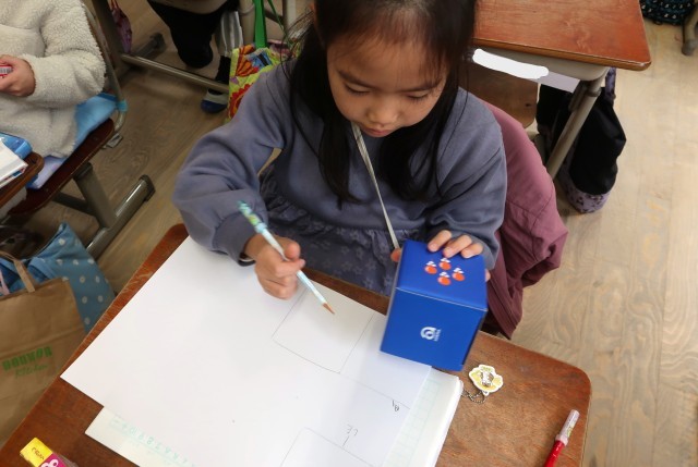持ってきた箱を紙に写し取り、面の形や数について調べました。