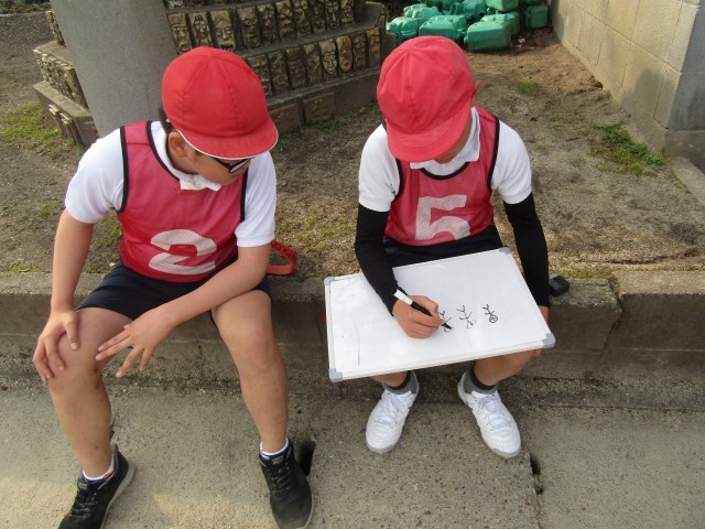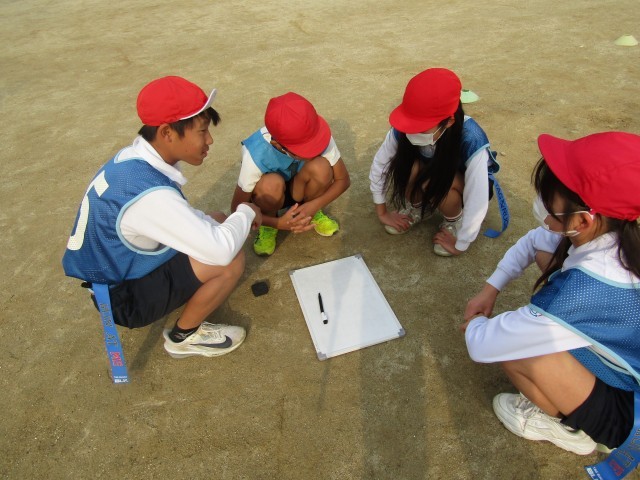 体育ではタグラグビーをしています。チームで、「壁つくって守ろう!!」「〇〇さんのタグ僕いくわ!!」など声を掛け合ってコミュニケーションを取っています。作戦タイムでは、相手に応じてどんな作戦が通じるか考えています。自分たちの作戦でトライを決めた時にはとても嬉しそうな顔を見せています!!ナイストライ!!