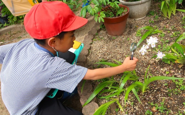 花や小さな虫をたくさん発見し、虫眼鏡でじっくりと観察(。-`ω-)