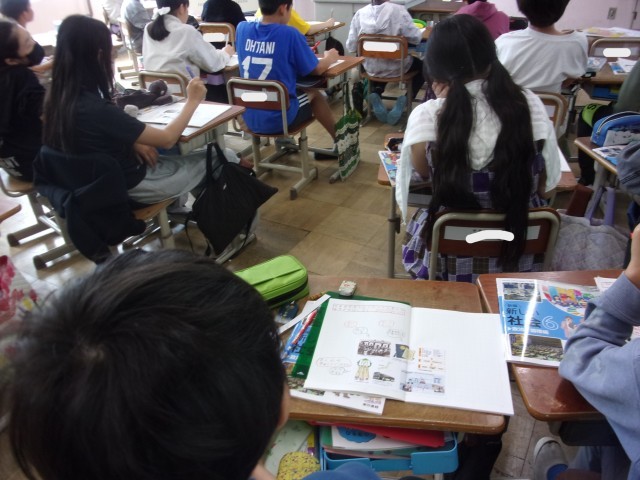 日本国憲法には、どのような考え方があるのかを話し合いました。人々の暮らしや、平和を願う考えがあることに気が付いていました。