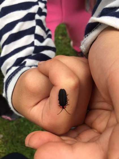 昨日の夜のナイトハイクでは、とてもきれいなホタルをたくさん見ることができました。今日もホタルを見つけて、喜んで観察しています。