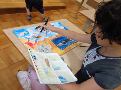 図工の時間に「ひゃっくん」という百円玉が冒険をするお話を読んで,絵を描きました。海に迷いこんだひゃっくんや,お祭りに行きたいひゃっくんなど,それぞれが考えた物語を発表しました。ひとつのお話から,いろいろな物語がうまれ,自分なりの方法で表現することができました。