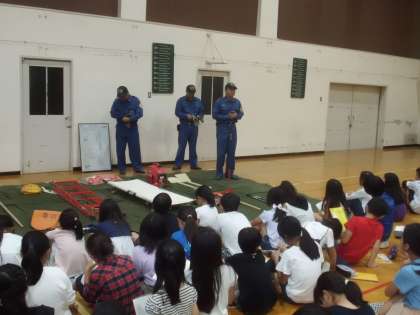 社会科の授業で,消防団の方に来ていただきお話をしてもらいました。消防団の活動内容を話していただいたり,災害時に持っていく道具を触らせてもらったりしました。子ども達は,初めて見る道具に興味を持っている様子でした。どのような道具があったかなど,お家でもお話を聞いていただけたらと思います。