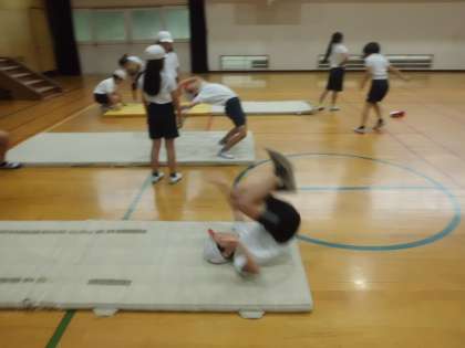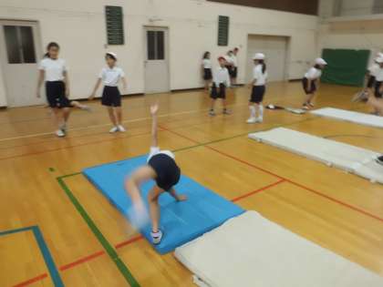 体育の授業で「マット運動」が始まっています。自分のできる技で連続技に挑戦したり,新しい技の習得を目指したりしています。子ども達同士で「足をもう少し伸ばしたらいいよ。」などアドバイスをする姿も見られています。たくさんの技に挑戦し,1つでも多く習得してほしいと思います。