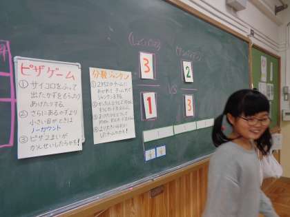 算数の時間に分数の学習をしました。ピザの模型を使って,サイコロの出た目の数だけピザをもらったりあげたりする活動の中で,それぞれの課題に沿った学習をしててきました。分数ジャンケンでは,2人1組になってジャンケンをして勝った人から,数字カードを選びます。分母の枠に貼るのか分子の枠に貼るのかを考えながら,数が大きくなるように貼るゲームをしました。楽しみながら量感を養い,分数の理解を深めることができました。