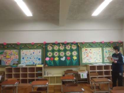 ここが1年生の教室です!覚えていますか?自分の名簿番号やグループもしっかり覚えておいて下さいね。金曜日にお家のポストに宿題を入れにいきます。がんばって取り組んでください。もしわからないところがあれば,お家の人に聞いてくださいね。先生も教科書を読んで,みなさんとお勉強できることを楽しみにしています。みなさんも,1年生でどんな学習をするのか,教科書をみておいてくださいね!