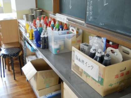 ここは,「ずこうしつ」です。ずこうでつかうどうぐがたくさんおいてあります。みんなが1年生のときに学習した「ころころぺったんシャカシャカ」でつかったローラーも,このおへやにかたづけられています。